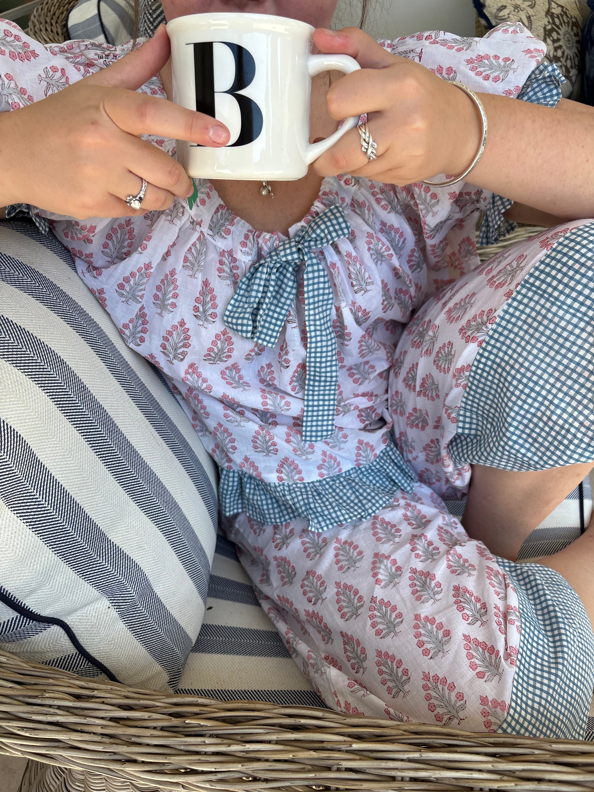 The Claire Crop Pant is a wide leg, elastic waisted pyjama pant with an adjustable drawstring and contrast hem. Designed to sit just above the ankle and made from lightweight, breathable fabrics, this pant is perfect for those hot summer nights.